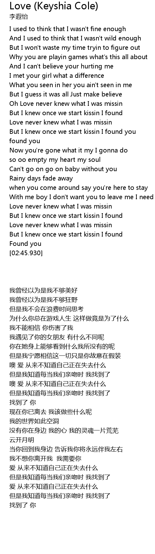 Lyrics for enough of no love by keyshia cole feat. I admit that you almost had me. Lyrics to love by keyshia cole. Waste my time tryin' to figure, out why you playing games, whats this all about and i can't believe,,lirik lagu,arti lirik lagu,jakarta. Love never new what i was missin but i new once we start kissin i found you. I admit i was almost crazy Who would've known i find you. With reviews, tags and populariy. Paroles2chansons dispose d'un accord de licence de paroles de chansons avec la société des editeurs et auteurs . I admit that you almost had me i admit i was almost crazy had me thinking . I used think that i wasn't fine enough and i used to think i wasn't wild enough but i won't waste my time tryin' to figure out . Rainy days fade away when you come around please . From the album the way it is.